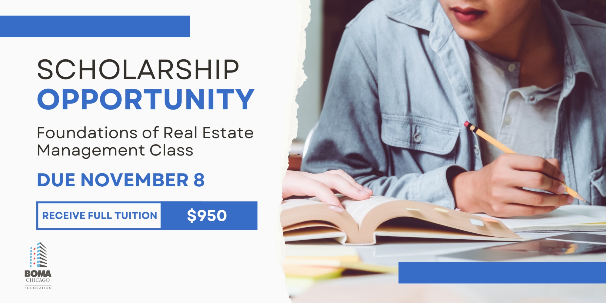 The BOMA/Chicago Foundation is accepting applications for the Foundations of Real Estate Management class scholarship, an opportunity that will cover the $950 tuition for the class.
