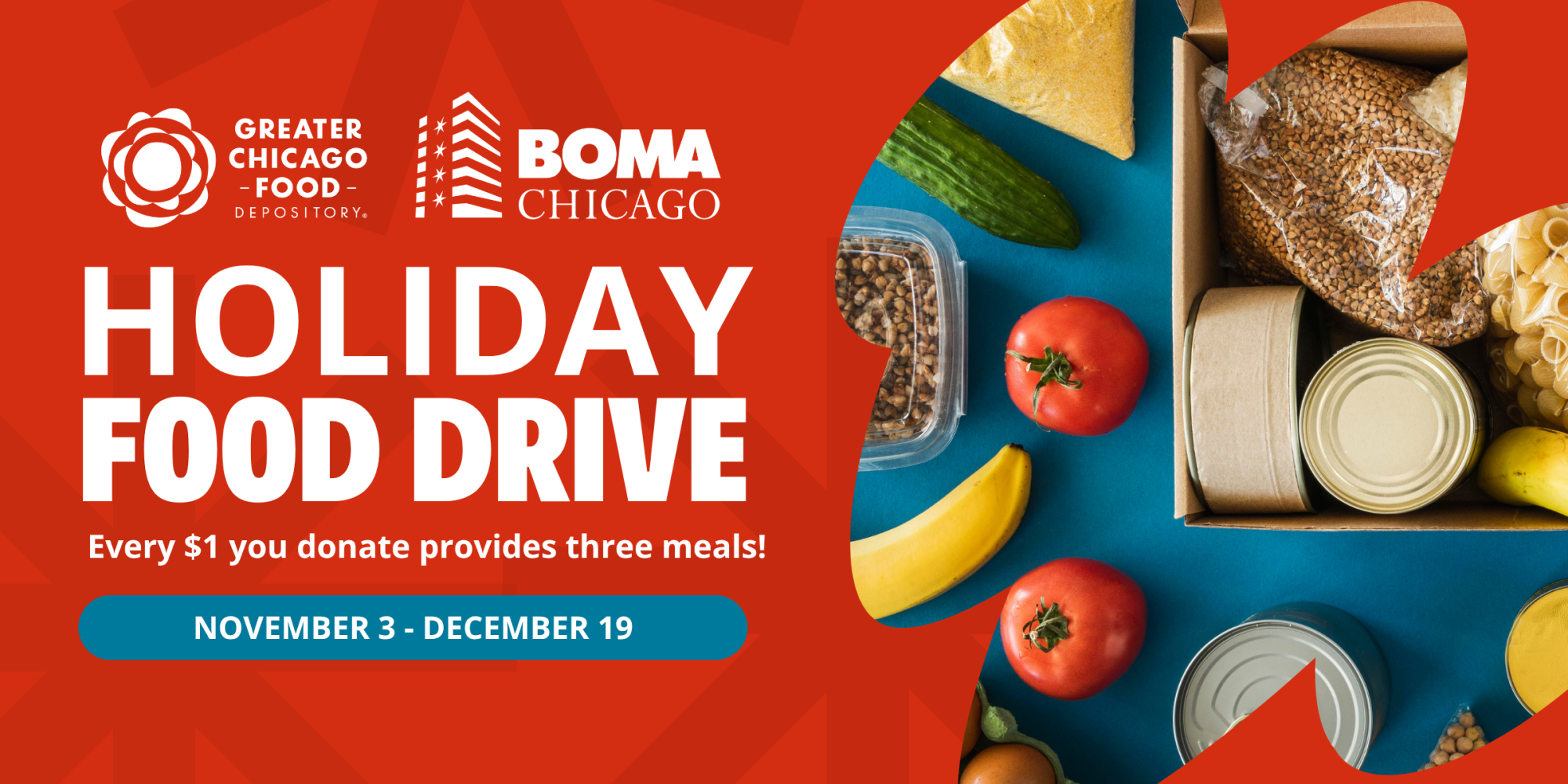BOMA/Chicago has partnered with the Greater Chicago Food Depository (GCFD) since 2008 for the annual holiday food drive. We have donated over 2 million pounds of food to the Chicagoland community. Last year, we raised more than $35,000, and our goal is to surpass that this year!